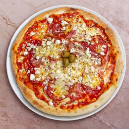 Pelat, kačkavalj, pečurke, Njeguška pršuta, paradajz, masline, origano